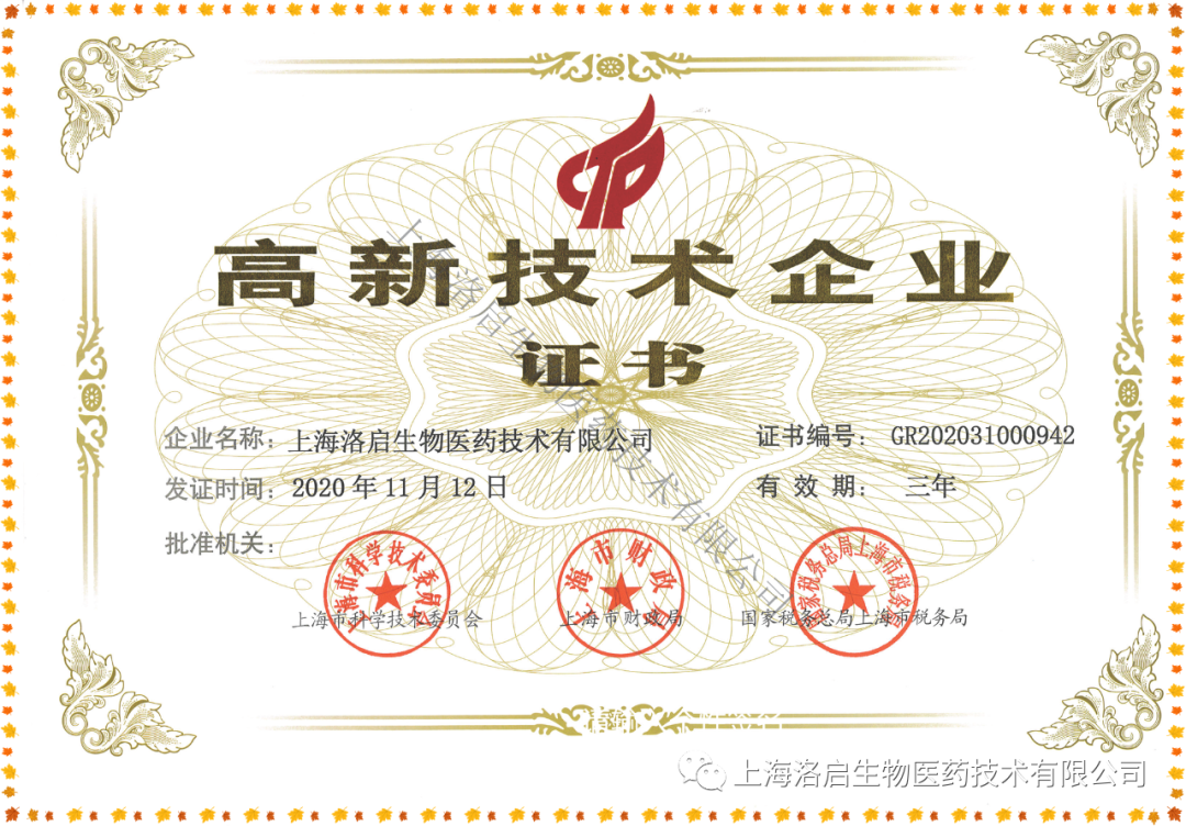 近期,上海九州ku游官网生物医药技术有限公司取得了由上海市科学技术委员会、上海市财政局、国家税务总局上海市税务局联合颁发的“高新技术企业证书”。